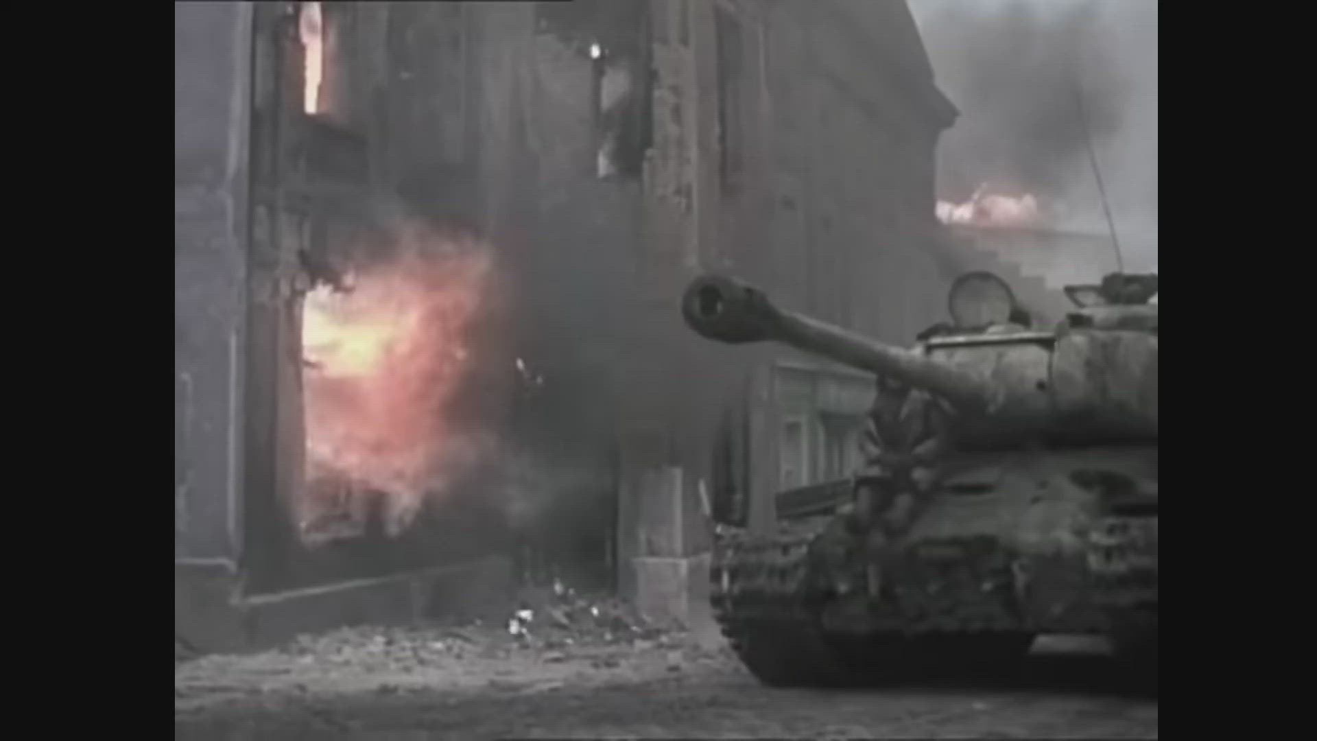 A Soviet tank rolls past a burning building during World War II.